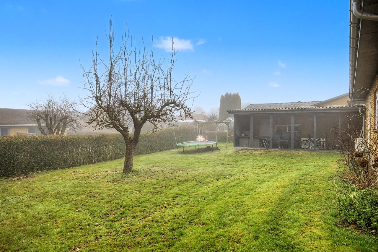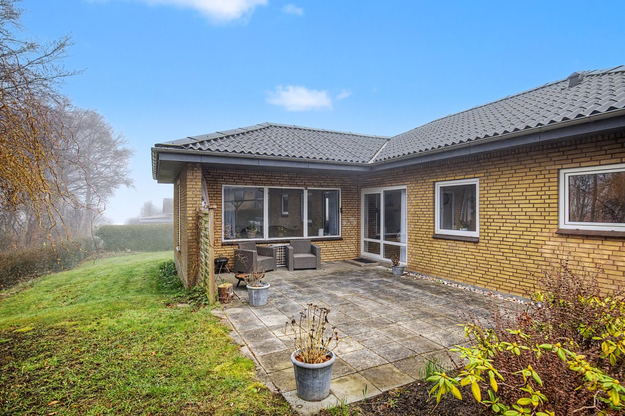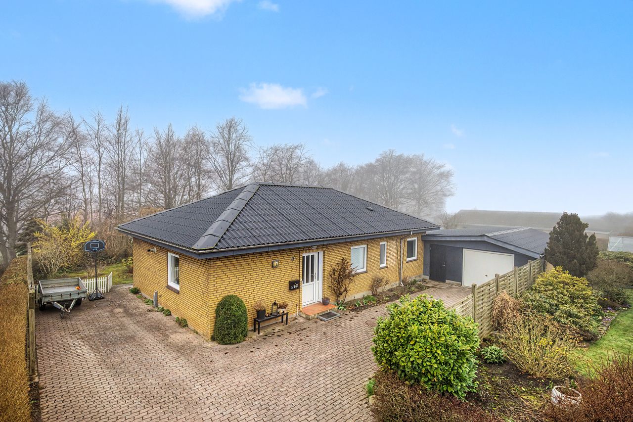 Boligen rummer hele fire værelser af forskellige størrelser, køkken-alrum, badeværelse med gulvvarme samt stue, som ligger i hjertet af huset. Fra stuen er der adgang til en stor terrasse, hvoraf en del er overdækket – perfekt til de danske sommeraftener. Desuden findes god garage, der giver fantastiske rammer til hobbymanden eller til ekstra opbevaring.