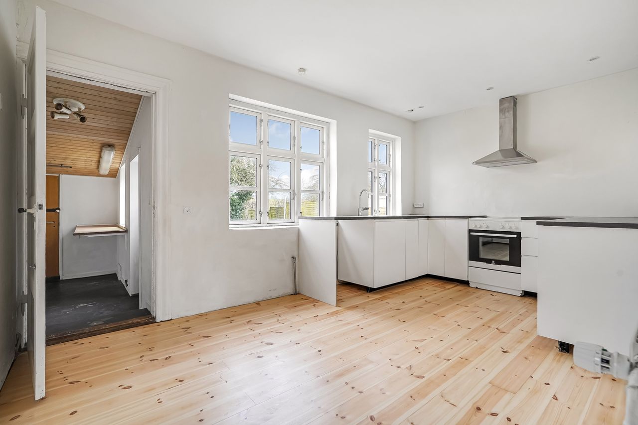 - Moderne køkken (2021): Nyd madlavningen i et lyst IKEA køkken med nyere plankegulv, der skaber en varm atmosfære.